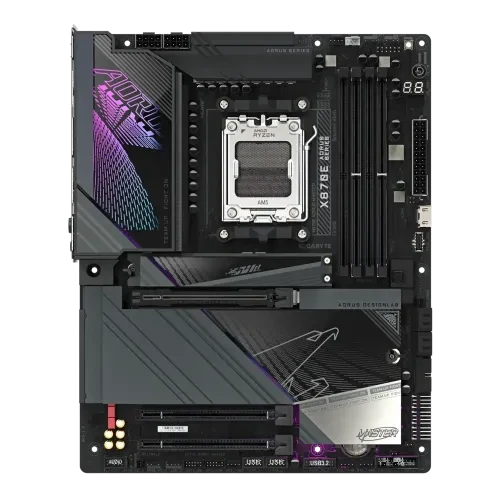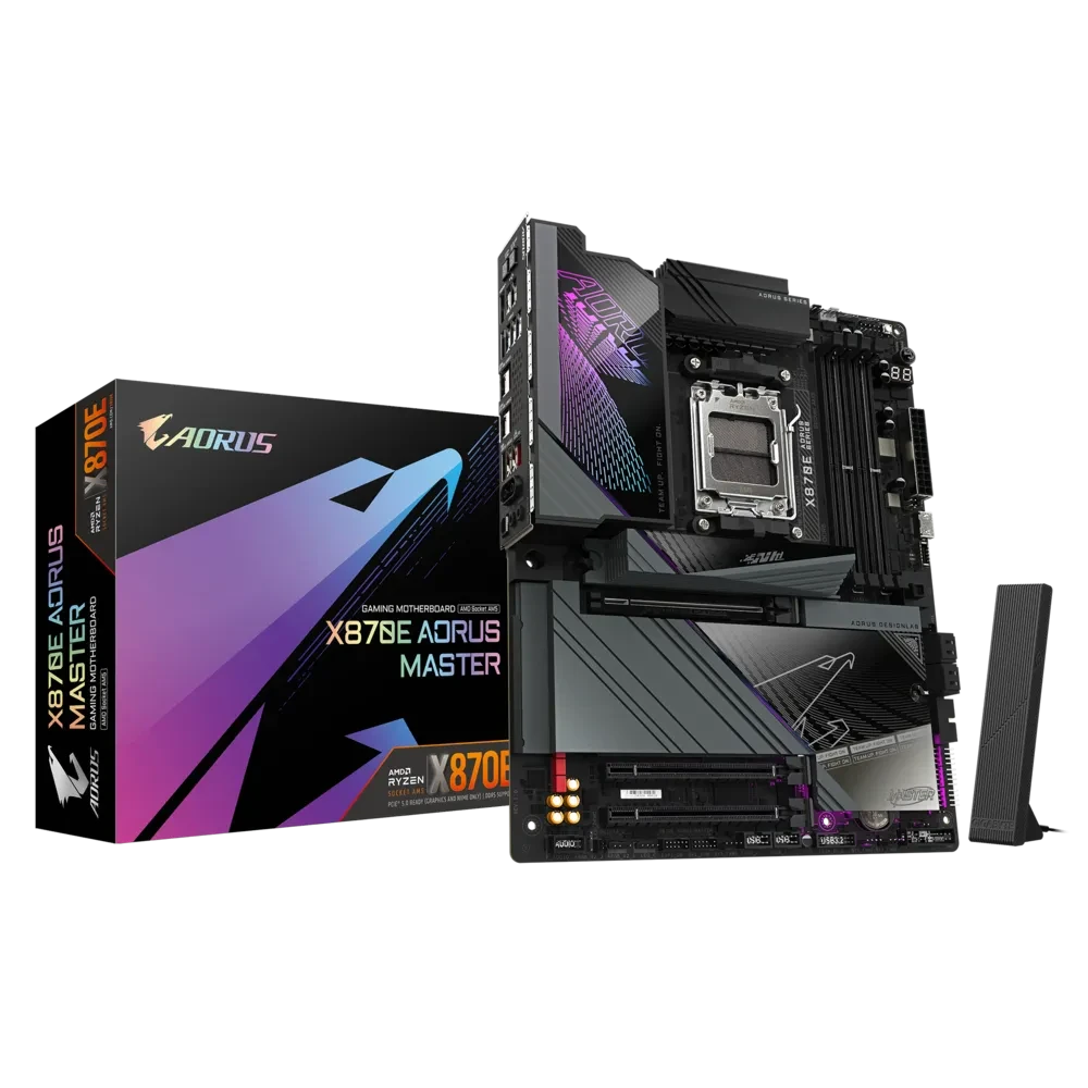 The GIGABYTE X870E AORUS MASTER is a flagship ATX motherboard engineered for enthusiasts and gamers who demand top-tier performance and cutting-edge features. Built on the AMD X870E chipset and supporting the latest AMD Ryzen™ 9000, 8000, and 7000 Series processors via the AM5 socket, this board is designed to push the boundaries of what’s possible in high-end PC builds. It offers robust power delivery with a digital twin 16+2+2 phase VRM design, ensuring stable overclocking and smooth performance under heavy workloads.
