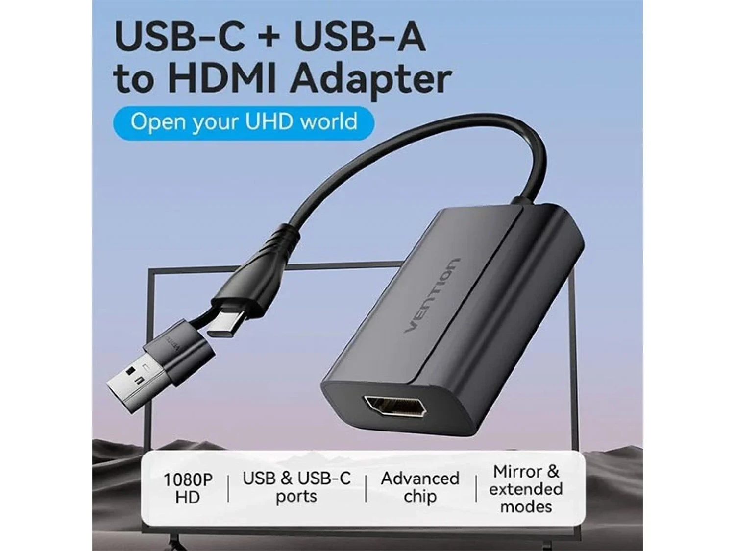 | Features | Brand: Vention Name: USB-C + USB-A to HDMI Adapter Model: ACYHB Color: Space Gray Resolution: 1080P@60Hz Shell: Aluminum Alloy Jacket: PVC OD: 3.8mm Length: 0.15 m Packing: Color Box |