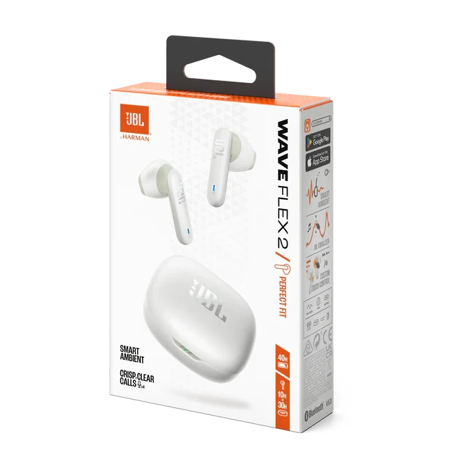 Quality sound just got easier—and more fun. JBL Wave Flex 2 earbuds feature exciting JBL Pure Bass Sound, plus Smart Ambient technology so you decide how much of the outside world you want to hear. Manage hands-free crisp, clear calls with just a tap of the earbuds. Use the JBL Headphones app to customize your sound and Voice Prompts language. Connect seamlessly with up to 8 Bluetooth® devices and switch effortlessly from one to another. Thanks to their shape, the Wave Flex 2 shine for their comfortable ergonomic design. And with 40 hours of playback time, they’re a great everyday sound companion.